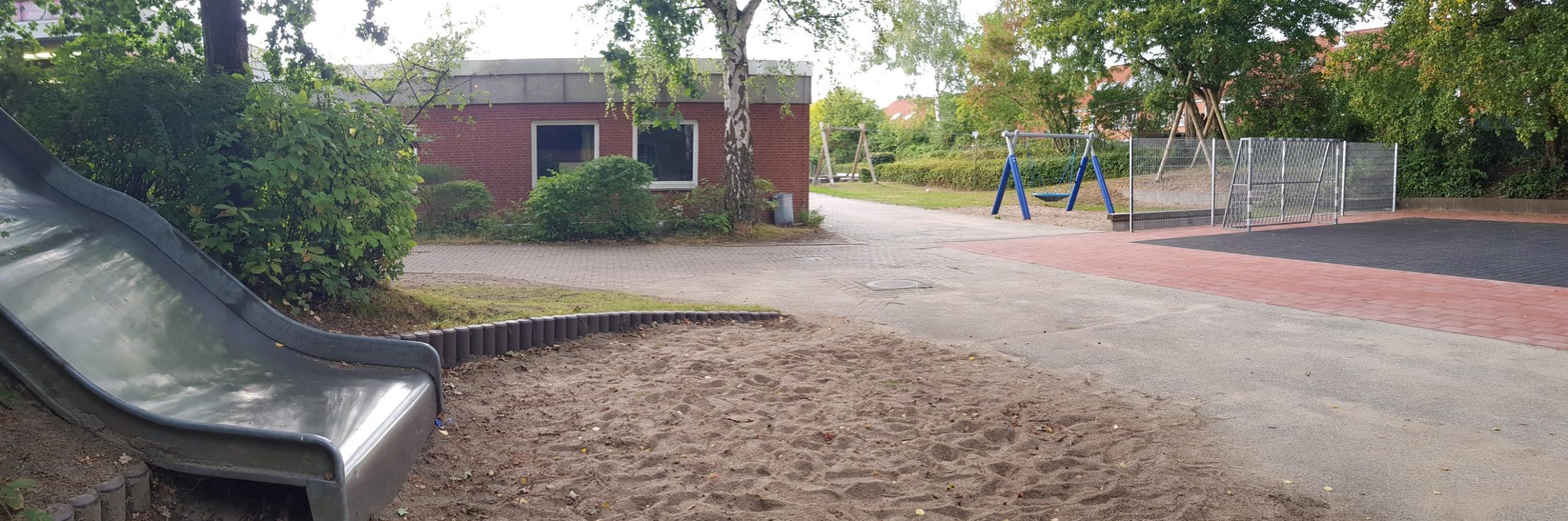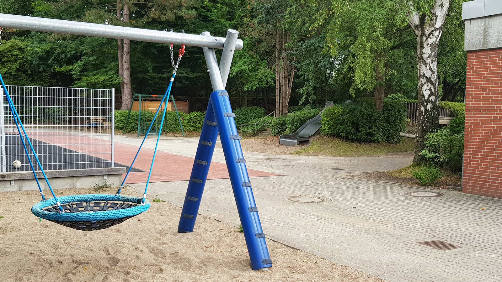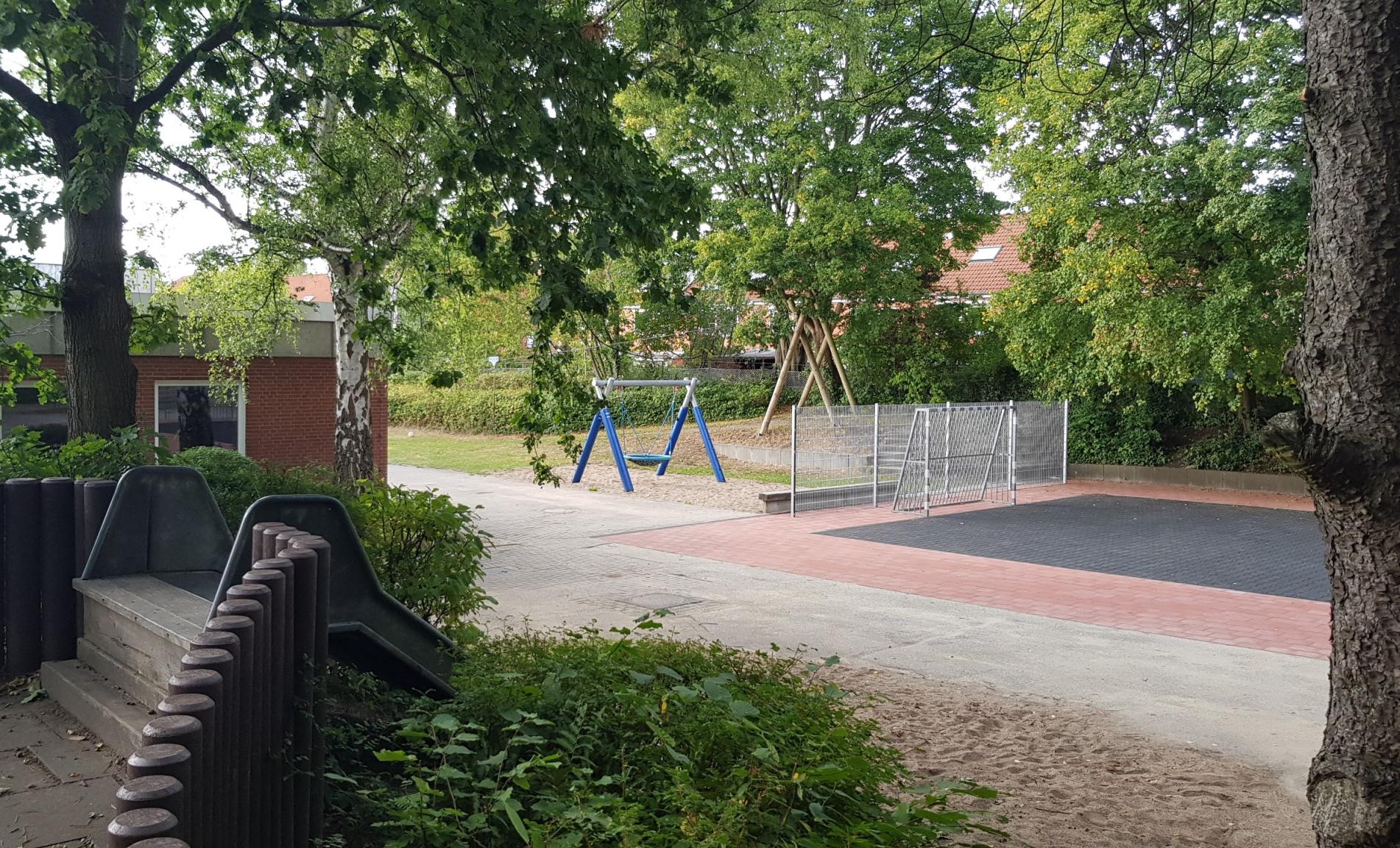 Ein großzügiger grüner Pausenhof lädt zu vielfältigen und aktiven Bewegungsmöglichkeiten ein. Neben Seilbahn, Nestschaukel, Wippe, Rutsche und Sandkasten sind auch ein Bolzplatz, ein Basketballfeld und Tischtennisplatten vorhanden.