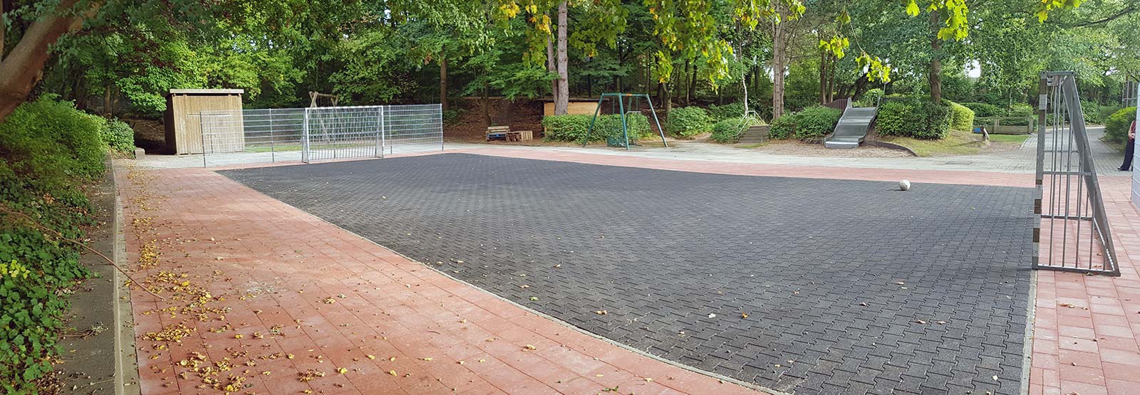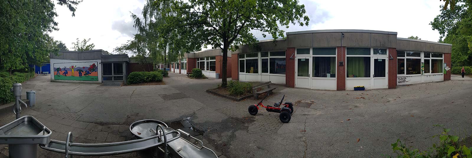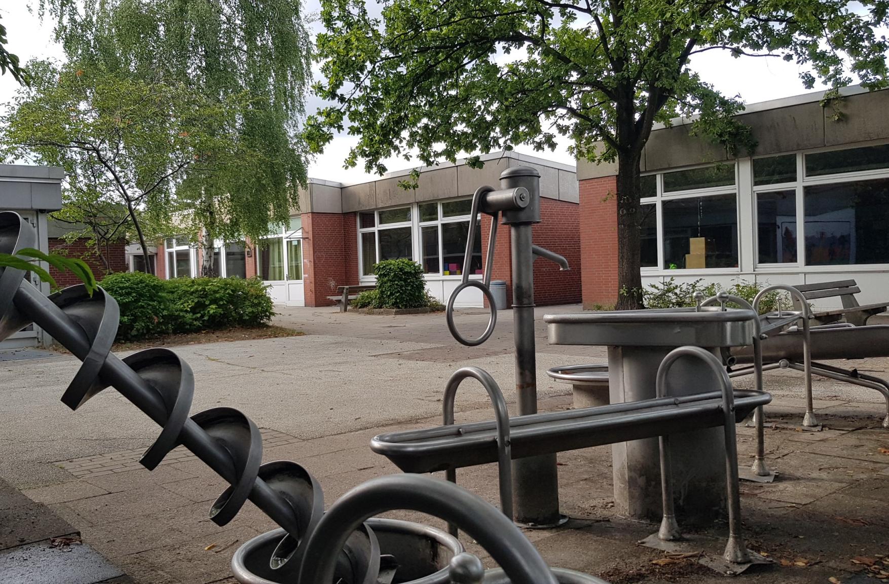 Ein großzügiger grüner Pausenhof lädt zu vielfältigen und aktiven Bewegungsmöglichkeiten ein. Neben Seilbahn, Nestschaukel, Wippe, Rutsche und Sandkasten sind auch ein Bolzplatz, ein Basketballfeld und Tischtennisplatten vorhanden.