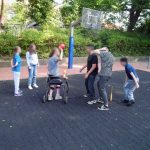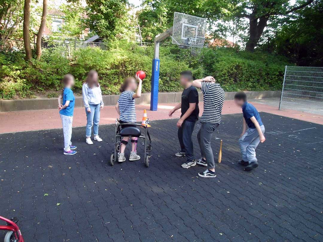 Der Schulhof wurde durchgängig barrierefrei und bewegungsorientiert gestaltet. Unser Abenteuerland hat einen großen Baumbestand. Verschiedene Freizeit- und Therapieräder, Roller und andere Fahrzeuge sind für alle Altersgruppen vorhanden.